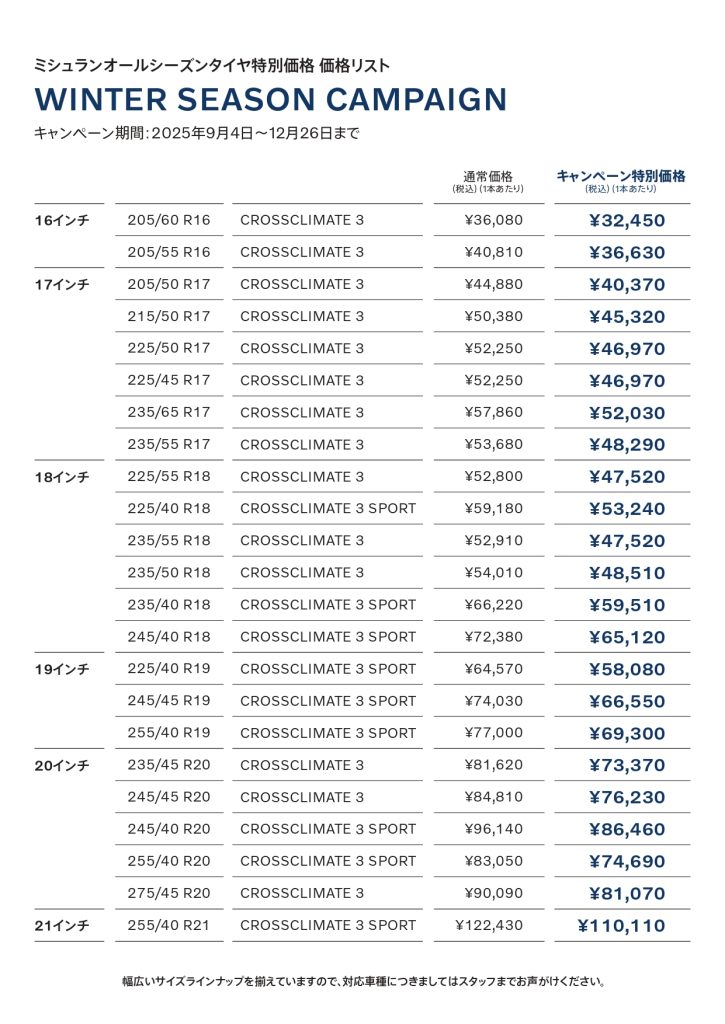 ミシュランオールシーズンタイヤ特別価格 WINTER SEASON CAMPAIGN