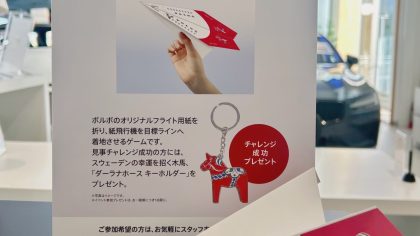 こんにちは。ボルボ・カー知多・刈谷です。 【New Year Eventのご案内】 紙飛行機 ボルボ・チャレンジ!ボルボのオリジナルフライト用紙を折り、紙飛行機を目標ラインへ着地させるゲームです。見事チャレンジ成功の方には、スウェーデンの幸運を招く木馬「...